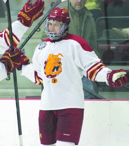 Rock You Like a HurriKane: Ferris State center Cory Kane celebrates a goal against Alaska-Fairbanks. Kane has six points on the season, putting him second on the team for point production. Photo By: Brock Copus | Multimedia Editor