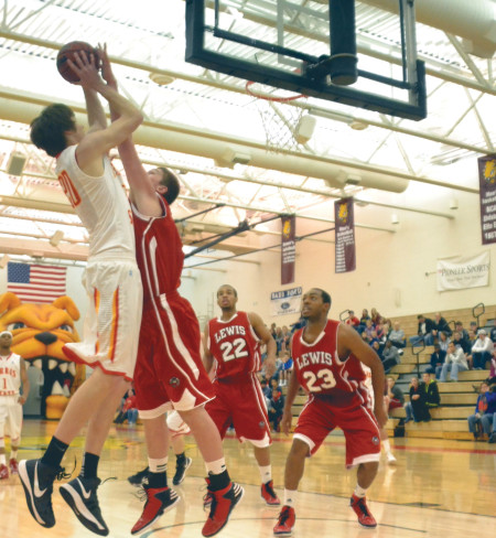 Ferris sophomore center Jared Stolicker goes up for a shot against Lewis defenders during the 2012-2013 season. The Ferris basketball team will start its season Oct. 24 against Madonna. Torch File Photo