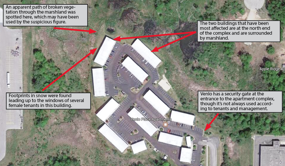 Since September of 2016, Ferris public relations seniors Megan Heck, Emma Thibault, Amanda Roehl and Breann Fuller reported a number of incidences in which they saw a figure dressed in black walking around the off-campus apartment complex, attempting to look in windows and observing the apartment complex for nights on end. Heck, Thibaut and Fuller are roommates while Roehl is in a different unit in the same building.
