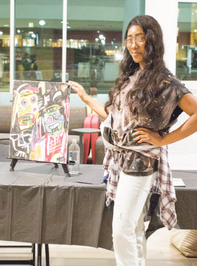 With her own painting, Ferris psychology senior Charnae Courts represented Jean-Michel Basquiat: the iconic artist from the 1980s. “They allowed us to incorporate our own thing into the program. Since I’m an artist, I wanted to focus on a prominent artist of that time,” Courts said.