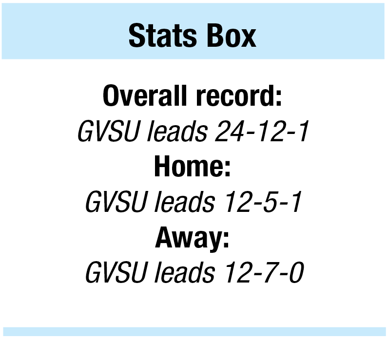 Grand Valley currently is on an eight game winning streak that started in 2000, with the closest game in this decade being a 20-21 loss during the 2000 season. Last year, the Bulldogs lost to Grand Valley 31-13 in Allendale. Grand Valley leads the all-time series with a 24-12-1 advantage.