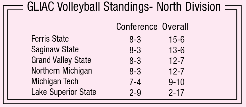 The Bulldog volleyball team sits atop the GLIAC North Division after the two home victories this weekend. The Bulldogs improved their overall record to 15-6, 9-4 at home this season.