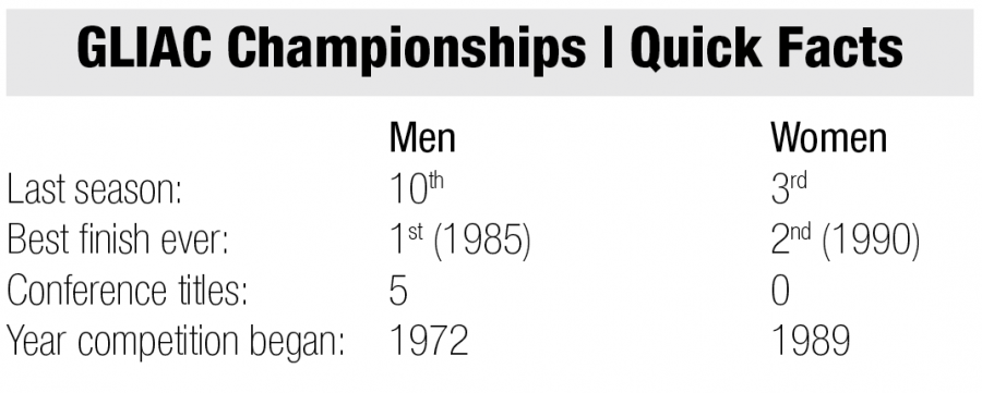 The women’s team will be looking to claim its first ever GLIAC title. In order to do so, they will have to beat a very competitive field including Grand Valley State, which has won seven consecutive GLIAC championships. The Bulldogs have finished third or better in each of their two previous events.