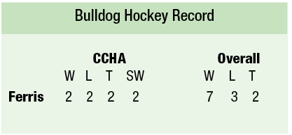 If a team reaches the shootout, it is recorded as a tie in the overall standings whether they win or lose. When a team’s CCHA record is given, it may contain four columns instead of three depending on whether or not they have won a shootout. The Bulldogs have a conference record of 2-2-2-2. The team has played six conference games, but there are eight numbers in the standings. The first three numbers combined give the number of games played.