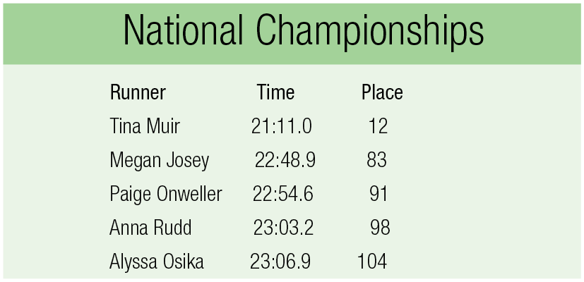 Junior Tina Muir led the Bulldogs with a time of 21 minutes and 11 seconds, which was good enough for a 12th-place finish. She earned All-American honors for the second consecutive season. Muir also finished 12th at the championship meet last season.