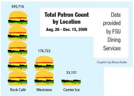 According to a survey of Ferris’ dining halls, 60.77 percent of total dining patrons from Jan. 6 to March 30 chose to dine at the Rock Café. Only 6.61 percent of patrons chose to dine at Center Ice with 32.62 percent preferring Westview.