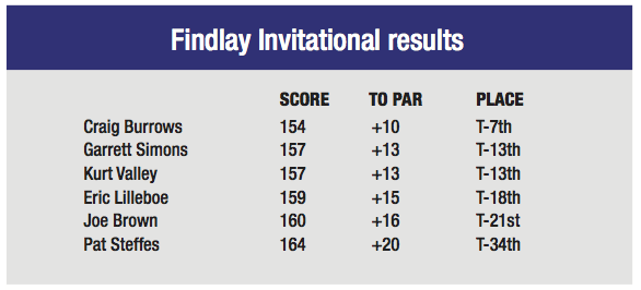 Senior Kurt Valley and junior Garrett Simons shot a 157 for the tournament, finishing in a three-way tie for 13th place. Senior Eric Lilleboe followed two strokes behind with a 159 to claim a share of 18th place.