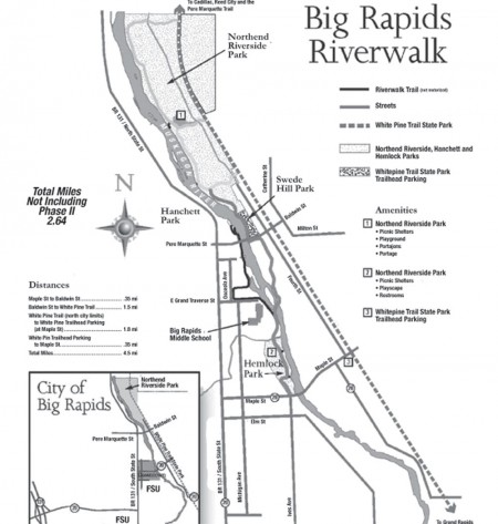 The Riverwalk connects numerous parks including Hemlock Park, Northend Riverside Park and the White Pine Trail State Park. This is part of Michigan’s “Rails to Trails” system running from Comstock Park to Cadillac.