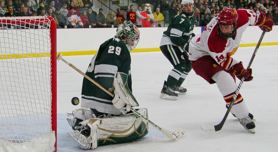 The first game of the home-and-home series was a much different story, though, as the Bulldogs and Spartans traded goals in a 3-2 victory for the Spartans on Friday. Michigan State’s Brett Perlini netted two goals in the contest, including a goal just 36 seconds into the game.