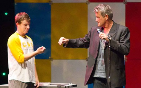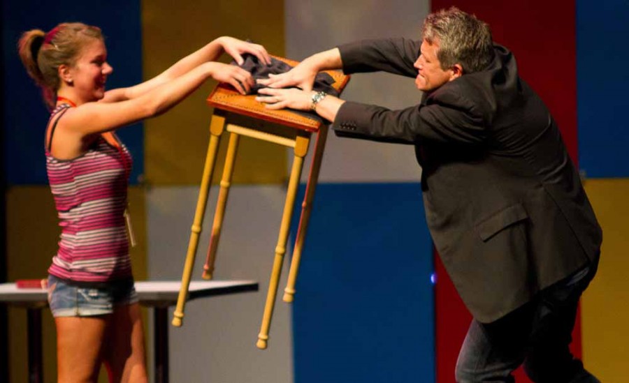 Moments later, with the help of randomly selected members of the audience, Karges made a table levitate, moved a block of wood with his mind, and wrote on a chalkboard without touching it.