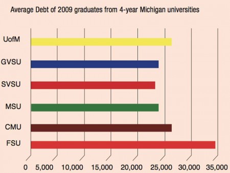 The average debt of a 2009 Ferris graduate is $34, 767 with a total of 76 percent of students leaving with debt. Two Ferris graduates discussed their amount of debt and what steps they recommend for current and future students to take to avoid as much debt as possible.