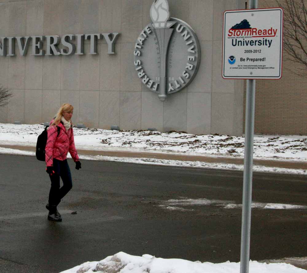 At the entrance to campus sits a sign indicating that Ferris is a storm-ready campus recognized by the National Weather Service. The website for the National Weather Service describes a “storm-ready” institution as one which “uses a grassroots approach to help communities develop plans to handle all types of severe weather.”