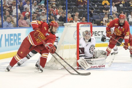 Wrapping Around: FSU sophomore forward Andy Huff attempts a wraparound shot on Union goaltender Troy Grosenick while Bulldog captain defensemen Tommy Hill anticipates for a rebound during the NCAA National Semifinals against Union College. Ferris State would go on to win 3-1 over the Dutchmen and moves on to play Boston College on Saturday. Photo By: Brock Copus | Multimedia Editor