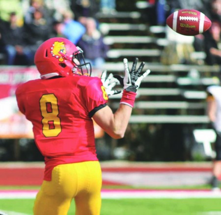 Making the Catch: Ferris State wide reciever Jake Lampman prepares to make the completion against Michigan Tech. The Bulldogs would go on to upset the Huskies 56-49. Photo By: Brock Copus | Multimedia Editor