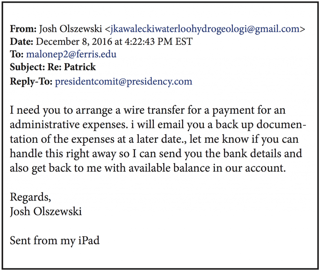 Ferris Student Government Treasurer Patrick Maloney received an email Thursday, Dec. 8, from pr*******@***il.com requesting an undisclosed amount of money through a wire transfer.