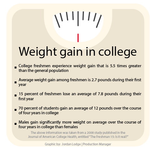 Luckily, according to the study, the average weight gain among freshmen was 2.7 pounds and, even though half of the participants did gain weight, 15 percent actually lost weight with an average of 7.8 pounds lost for men and seven pounds for women.
