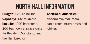 The cost of the new residence hall is budgeted at no more than $28.15 million. This price reflects innovative updates, with North Hall boasting a fitness room, five lounges and was built with a “living learning component” in mind. Unlike traditional residence hall designs, students can have some of their classes in the hall they are living in. Enrollment in these courses will not be limited to North Hall residents.