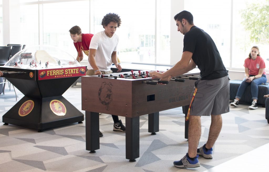 Ferris students play games in the North Hall Living Learning Center located on the first floor of the new residential building. Photo by: Odette Lopez | Torch Photographer
