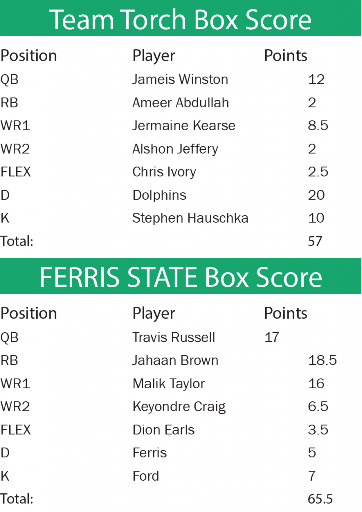 A week five 13-3 Bulldog victory made for the closest Ferris Fantasy Football week of the 2017 season, though the Beaulldogs still were not able to garner enough points for the win.