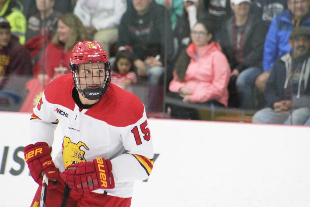 But the offense for the Bulldogs came alive in the second half of the first, as senior forward Mitch Maloney netted a power-play goal. Sophomore forward Dominic Lutz followed up with a goal of his own to close out the first period.