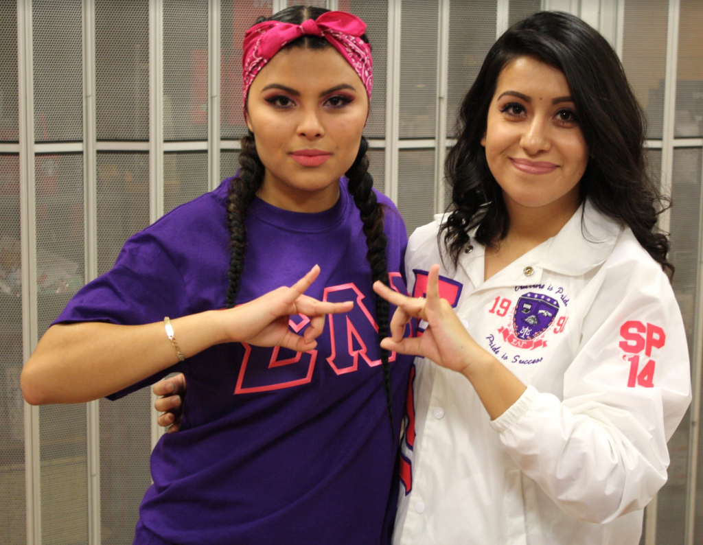 Ferris social work junior Anna Rivera and Ferris communications graduate student Candy Legaria celebrate new sorority members for Sigma Lambda Gamma. Photo by: Megell Strayhorn | Torch Photographer
