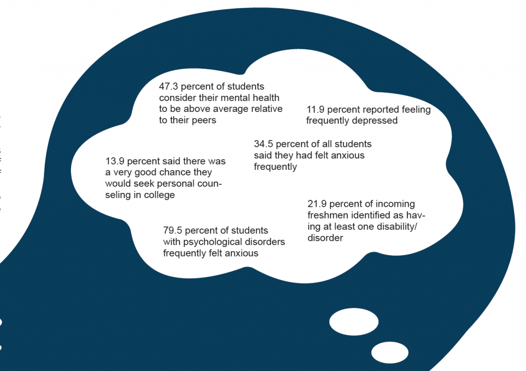 The University of California, Los Angeles’ Higher Education Research Institute’s annual Freshman Survey in 2016 found record-breaking statistics in regard to students’ mental health. Of the incoming first-time, full-time college students surveyed, 34.5 percent reported that they frequently felt anxious and 11.9 percent said they frequently felt depressed in the past year.