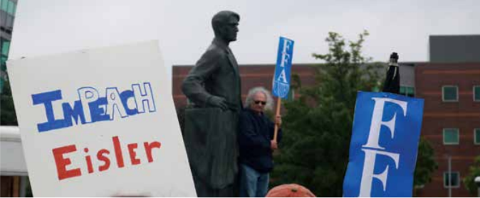 Eisler was unavailable for comment and canceled his State of the University address on Founders’ Day Thursday, Aug. 30. The statement posted said it was canceled “to ensure everyone can enjoy Founders’ Day.” FFA members picketed in the North Quad, where Founders’ Day activities were held, many of them holding signs that said “Eisler Resign.”