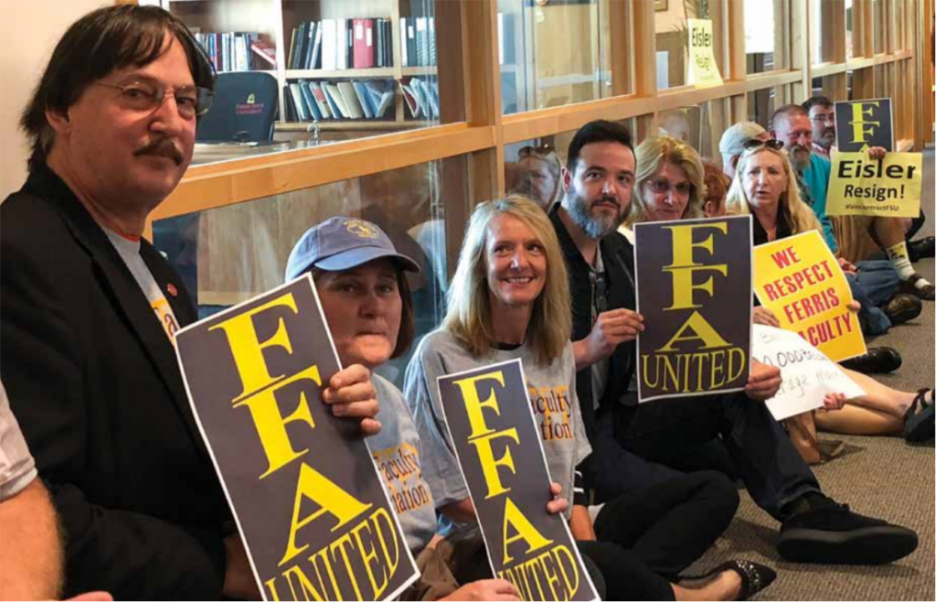 As a demonstration of their frustration, Ferris Faculty Association (FFA) members organized a sit-in and decided to hold a vote of no confidence against President David Eisler. After months of negotiations, weeks of picketing and a day of striking, 145 faculty members participated in a sit-in at Eisler’s office Wednesday, Sept. 12. According to Ferris physical science professor and FFA President Charles Bacon, the FFA reached a point where they no longer have faith in Eisler.
