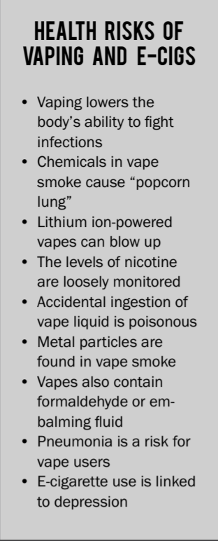 The increasingly popular activity has many hidden health concerns. According to benefitsbridge.unitedconcordia.com, vaping can be just as addictive as cigarette smoking.