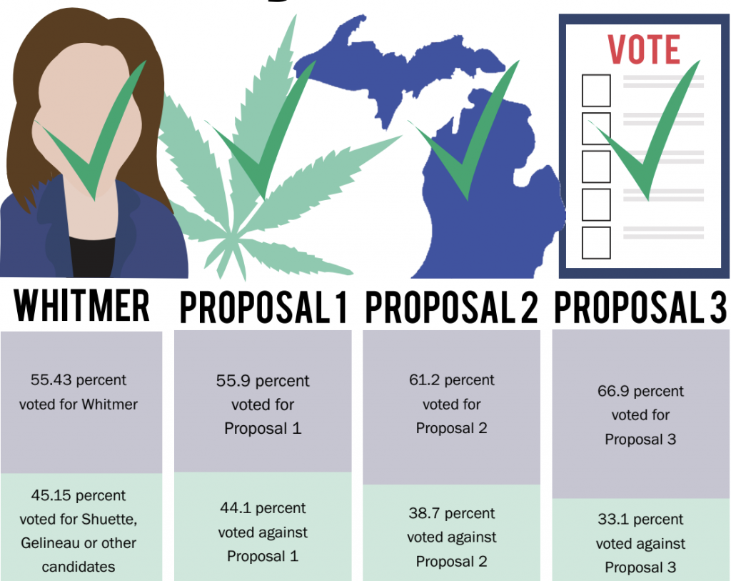 Proposal 3 covered voting policies in our state and passed with 65.13 percent of the votes in favor and 34.87 percent against, according to the Michigan SOS website. The proposal will now add eight additional policies to Michigan’s Constitution to make voting easier for citizens, including straight-ticket voting, automatic voter registration, same-day voter registration and no-excuse absentee voting.