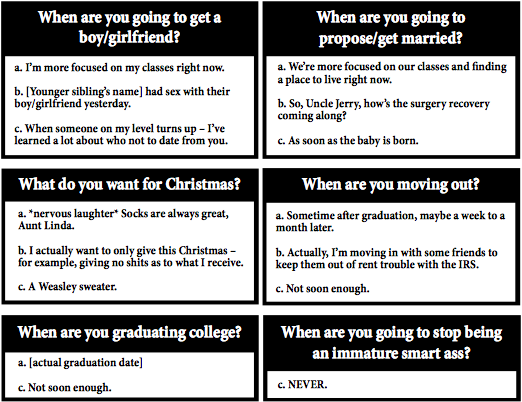 With the rapid succession of “family holidays” – Thanksgiving, Christmas, Hanukkah, New Year, etc. – some young people dread going home because their family interrogates the hell out of them.