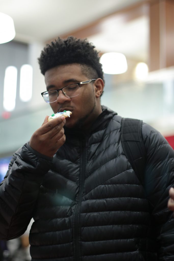 Ferris digital animation and game design freshman Alando Steele takes the first bite of his frosted sugar cookie. Photo by: Megell Strayhorn | Multimedia Editor