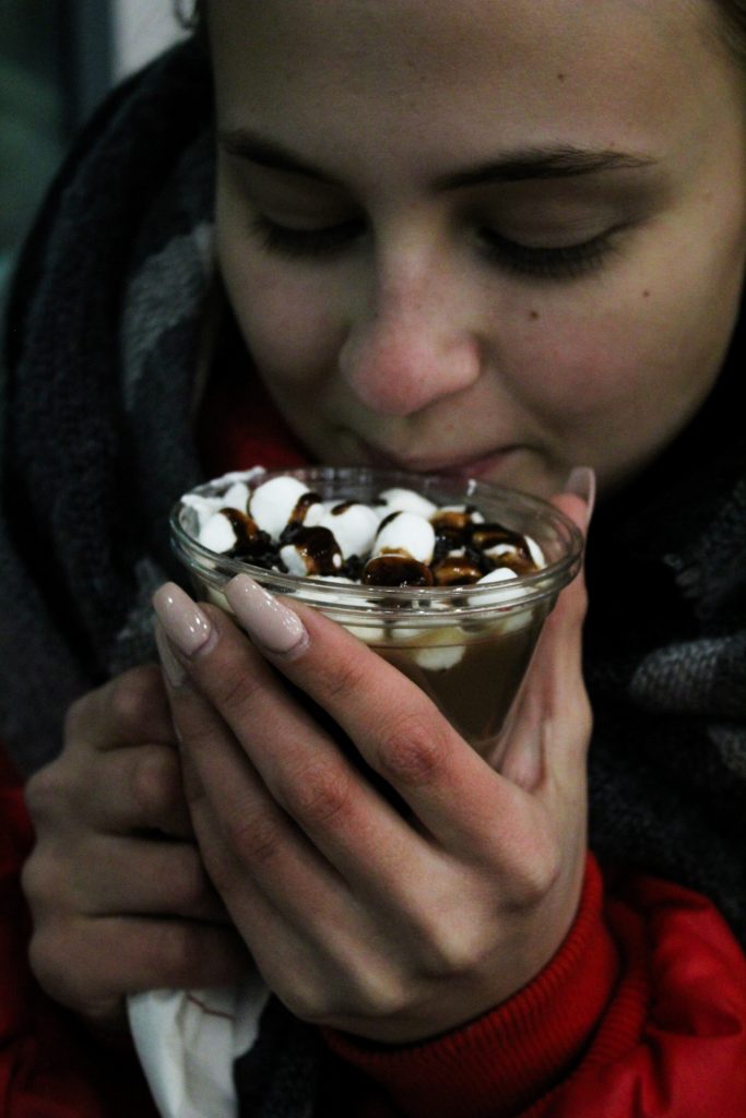 Ferris marketing senior Victoria Baklashev sips on some hot chocolate to warm up. Photo by: Taylor Davis | Torch Photographer
