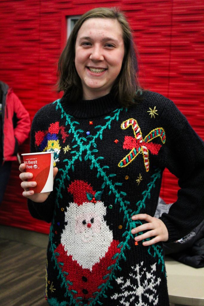A student is feeling festive in her Christmas sweater. Photo by: Taylor Davis | Torch Photographer