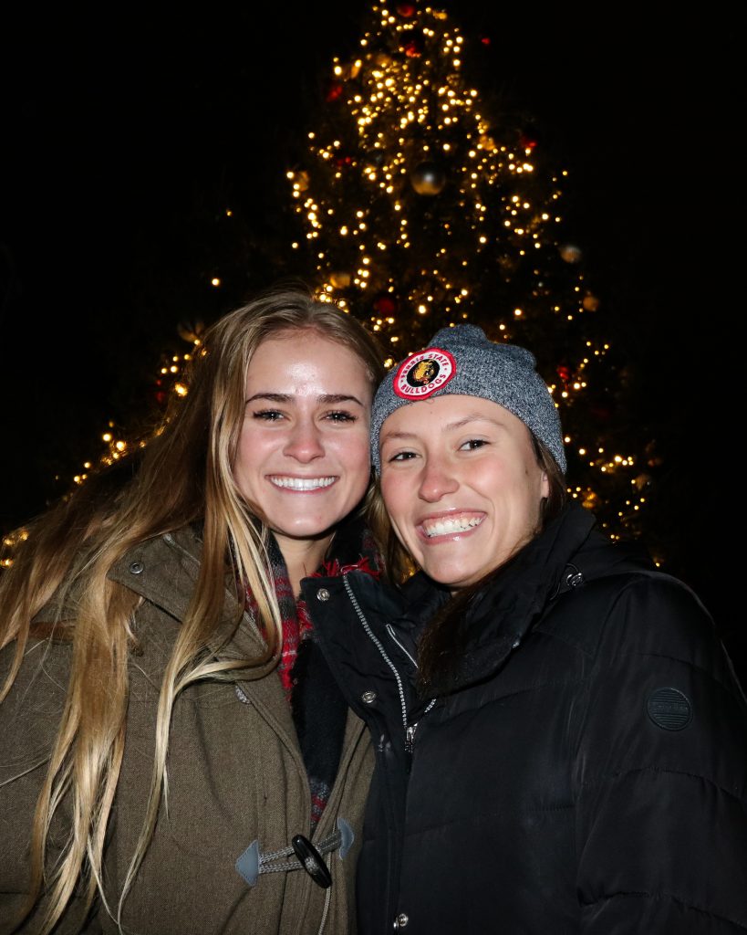 Ferris political science sophomore Allyson Faulkner and social work sophomore Brooke Cunningham are all smiles in front of the Christmas tree. Photo by: Megell Strayhorn | Multimedia Editor