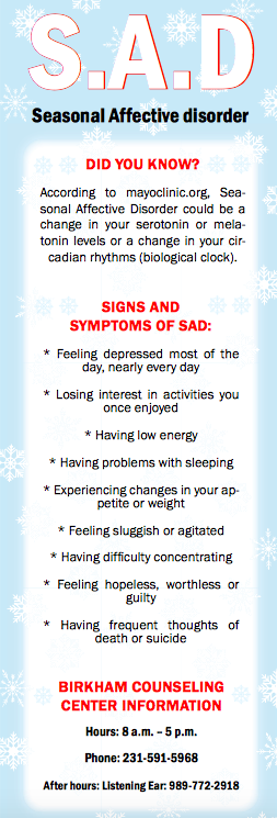 While some students are feeling more of the winter blues this season, it’s important to recognize the signs and symptoms of a more serious affliction, such as Seasonal Affective Disorder (SAD).