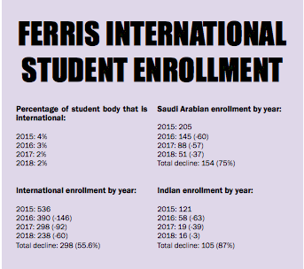 The political aspect of the decline goes beyond American politics. Saudi Arabia sends the fourth most international students to America. Due to governmental changes reducing the amount of scholarships given to international students, the country has seen a major decline in students seeking foreign education. This has greatly impacted international enrollment at Ferris.