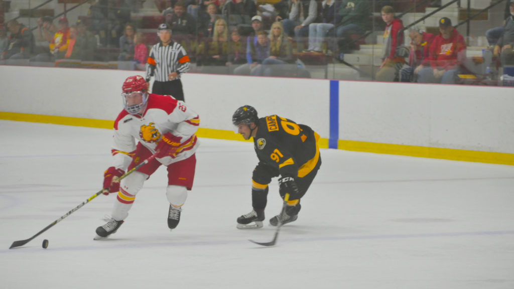 Despite the sloppy passing, the defensive efforts and many shots towards the goal allowed the Bulldogs fought back and forth with the Warriors. Towards the end of the third period, Ferris sophomore defenseman Justin Smith got tied up with Waterloo’s Michael Scanlan on a breakaway, which awarded the Warriors a penalty shot.