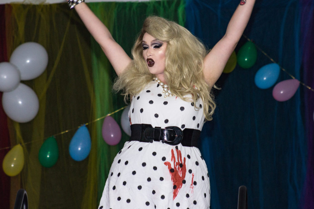 The UC ballroom was set up like a beauty pageant and set a serious, yet fun tone for the entire event. Five drag divas performed both onstage and off, interacting with the crowd to sing, dance and accept tips. The songs the queens performed to varied from upbeat and cheerful, to slow and dramatic.