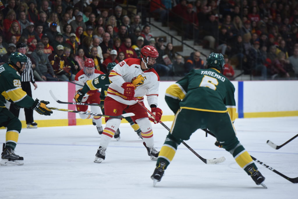 This offensive output by the Wildcats forced Ferris head coach Bob Daniels’ hand at the goalie position. As the second period began, freshman goaltender Carter McPhail replaced sophomore goaltender Roni Salmenkangas.