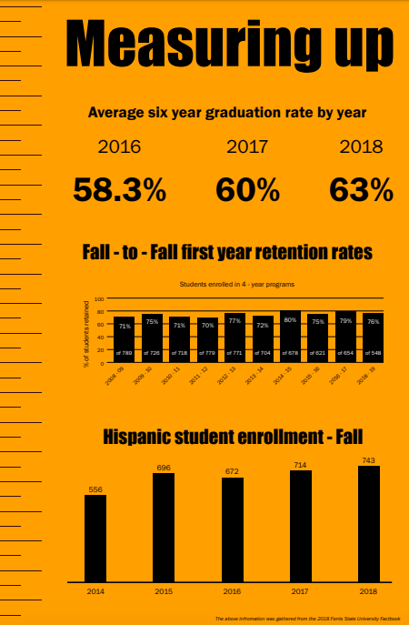 Ferris has been finding ways to help students stay and finish their degrees here. Of the retention statistics from 2018-19, only a combined total of 79% of first year (in any college) students were retained.