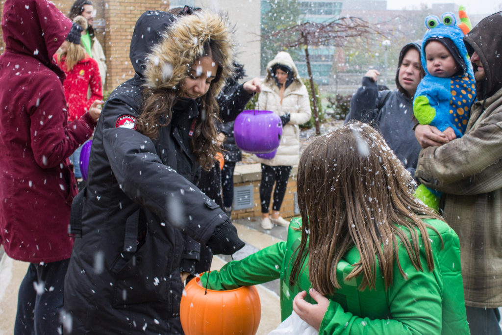 “We were supposed to hand out candy to little kids, but now we are handing out candy to students who are walking in the snow now. It’s been fun for us to be out here,” Klairter said.
