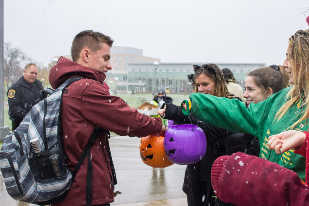 Students like Ferris pre-medical student Grant Klairter and others, many dressed in costumes, lined the circle of the Carillon Tower handing candy to students who happened to walk by during their 4 p.m. to 5 p.m. event.