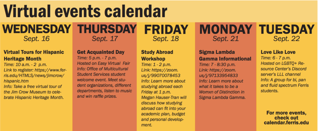 The upcoming events that will be held on Easy Virtual Fairs can be found at https://ferrisstate.easyvirtualfair.com/#!home or on the Ferris calendar, calendar.ferris.edu