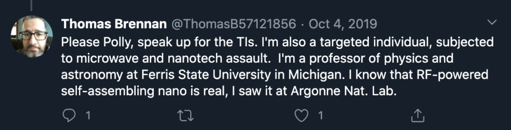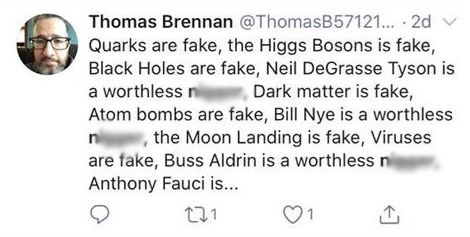 A tweet from Oct. 4, 2019, identifies Brennan, saying “I’m a professor of physics and astronomy at Ferris State University in Michigan.” The last public tweet about COVID-19 from the account reads “Covid19 is simply (their) attempt to turn us all into slaves. They’ve failed.”