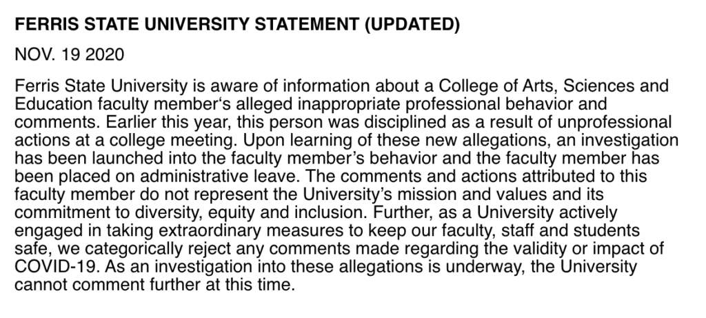 “The comments and actions attributed to this faculty member do not represent the College’s or University’s mission and values or the institution’s commitment to diversity, equity and inclusion.”