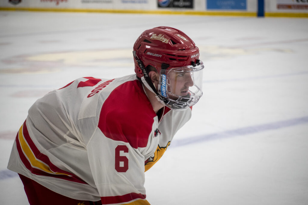 At 1:11 in the second period, the Falcons had a penalty for cross-checking, and the Bulldogs scored their first goal at 3:05 on the power play. Junior forward Ethan Stewart scored his third goal of the season and was assisted by freshman forward Mitch Deelstra and senior forward Liam MacDougall.