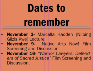 Other events include hands-on cultural activities and movie screenings, such as “Warrior Lawyers: Defenders of Sacred Justice,” an educational PBS documentary produced by University of Michigan alumnus Audrey Geyer. Following this viewing, Geyer will be present for a group discussion.