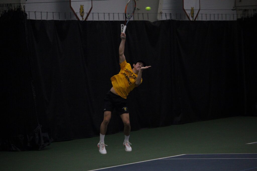 In singles, the team looked to stay aggressive. Ferris’s top singles player is Guerre, and he fell short 7-5 and 6-3 to Jakob Riglewski. Despite his loss, the energy on the first court did not disappoint with both players exchanging yells after big points and volleys.