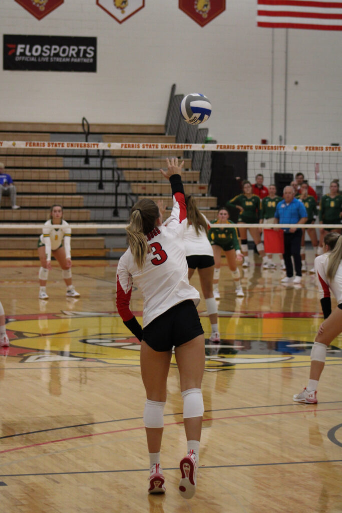 Friday’s match betwen the Bulldogs and Northern Michigan was a battle for first place in the GLIAC. Ferris took the first two sets 26-24 and 25-22.